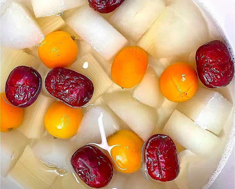 Cho quất, lê, mía, táo đỏ đã chuẩn bị sẵn vào nồi, cho lượng nước và đường phèn thích hợp vào nồi rồi nấu chung. Nấu trên lửa lớn trong 10 phút để dậy mùi vị của nguyên liệu, sau đó bật lửa liu riu tầm 30 phút. Đổ vào bát và dùng ấm.
