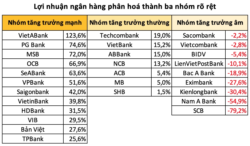 Trong nhóm ngân hàng tư nhân, sự phân hóa còn diễn ra còn diễn ra mạnh mẽ hơn khi hình thành ba nhóm rõ rệt theo mức độ tăng trưởng lợi nhuận.