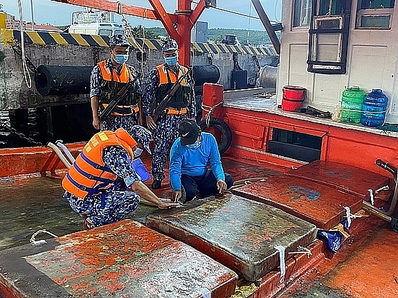 Cụ thể, rạng sáng ngày 3/4, tại khu vực biển cách Tây Bắc đảo Thổ Chu (Kiên Giang) khoảng 13 hải lý, lực lượng thuộc Đoàn Trinh sát số 2 đã phát hiện và kiểm tra tàu vỏ gỗ số hiệu TG 92855 TS có dấu hiệu vi phạm.