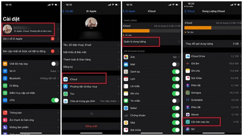 Để bật hoặc tắt sao lưu iCloud, trong Cài đặt > nhấp vào tên ID Apple của bạn > iCloud > Quản lý dung lượng > nhấn vào Các bản sao lưu.