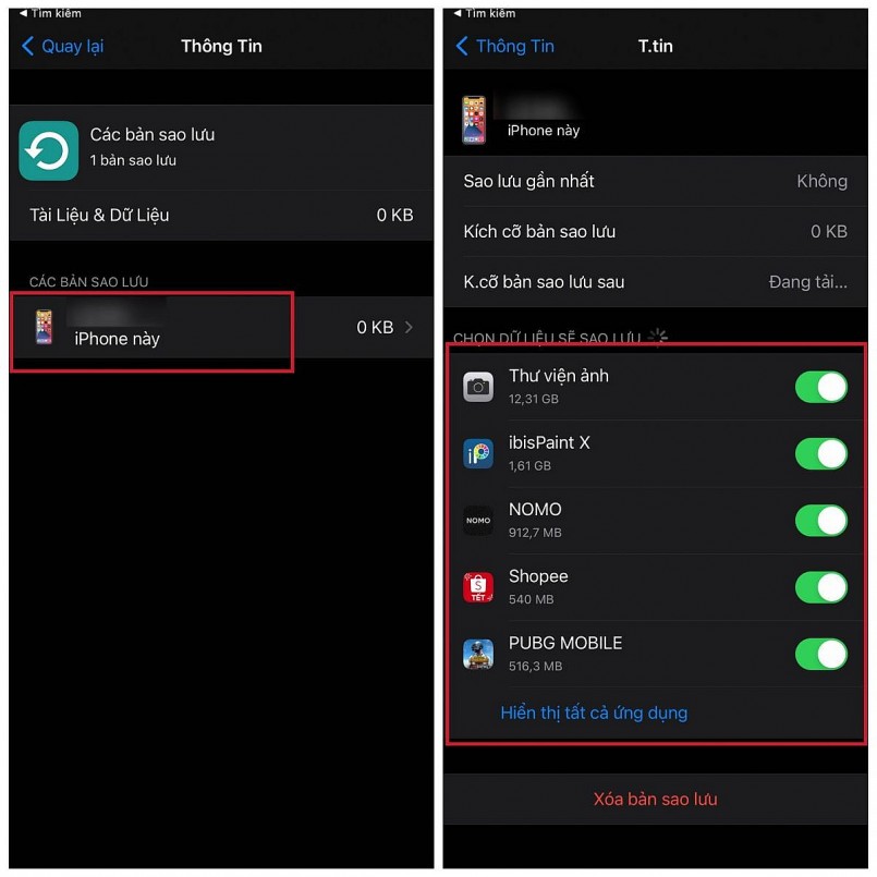 Chọn thiết bị muốn tắt/bật sao lưu > tiếp theo hãy tắt/bật ở các mục ứng dụng.