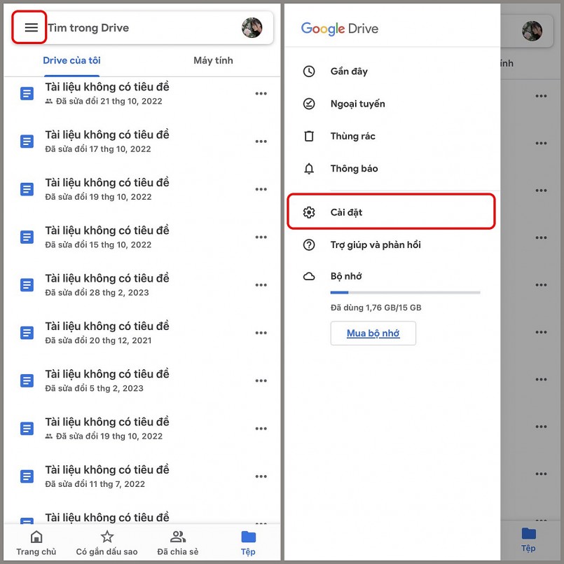 Bước 1. Bạn truy cập Google Drive, nhấn chọn biểu tượng 3 dấu gạch ngang, sau đó chọn Cài đặt.