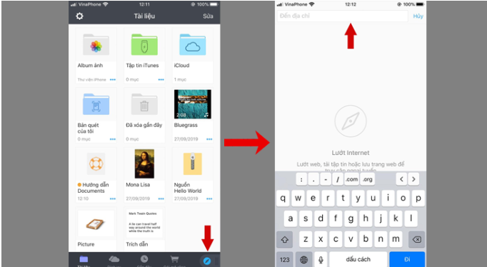 Bước 2: Chọn biểu tượng "la bàn" ở góc phải bên dưới màn hình và vuốt sang trái. Sau đó, nhập tên website bạn muốn tải bài hát vào ô Đến địa chỉ