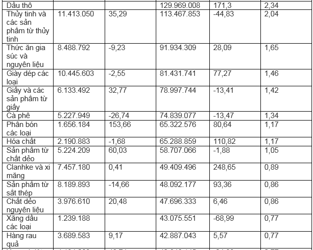 Một số nhóm mặt hàng có kim ngạch xuất khẩu tăng trưởng mạnh trong năm 2022 so với năm trước: Máy móc thiết bị, dụng cụ và phụ tùng tăng 60,7%; dầu thô 171,3%; phân bón các loại tăng 80,6%; hóa chất 110,8%.