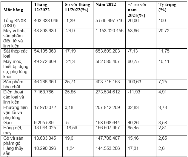 Dẫn đầu nhóm các mặt hàng xuất khẩu trong năm 2022 là nhóm mặt hàng máy vi tính, sản phẩm điện tử và linh kiện, đạt 1,1 tỷ USD, tăng 53,6% so với năm trước, chiếm tỷ trọng 20,7% tổng kim ngạch xuất khẩu.
