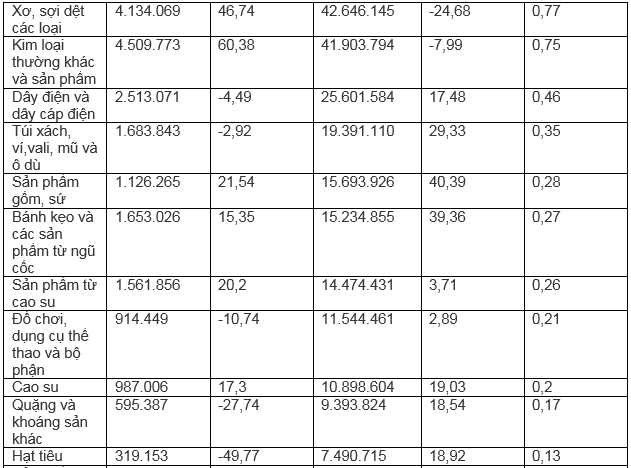 Tiếp sau là nhóm hàng sắt thép các loại, đạt 653,6 triệu USD trong năm 2022, giảm 7,1%, chiếm 11,7% tổng kim ngạch xuất khẩu.