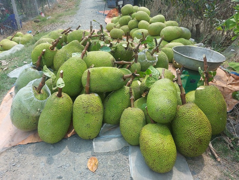 Những quả có trọng lượng từ 8 kg trở lên, tương đối tròn trịa, không bị sâu, ko bị nấm là thuộc loại 1. Loại 2 sẽ là những quả mít có trọng lượng từ 6 đến dưới 8kg. Còn loại dưới 6kg hoặc sâu, nhỏ, móp méo sẽ xếp vào hàng bán chợ. Những quả thuộc hàng chợ sẽ được thương lái thu mua từ 25.000 - 30.000 đồng/kg.