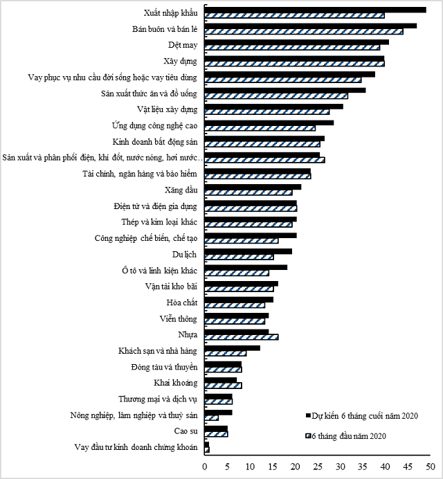 Theo kết quả điều tra các tổ chức tín dụng (TCTD) của của Vụ Dự báo Thống kê (Ngân hàng Nhà nước), trong 6 tháng cuối năm 2020, 49% TCTD kỳ vọng xuất nhập khẩu sẽ là động lực trưởng tín dụng của hệ thống, tiếp đến là bán buôn, bán lẻ (47%), dệt may (41%) và xây dựng (40%).