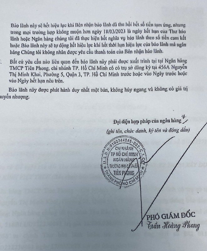 Trong chứng thư bảo lãnh số BG 0092233 ký ngày 11/8/2022, TPBank chi nhánh TP Hồ Chí Minh nhấn mạnh: Cam kết vô điều kiện và không hủy ngang thanh toán cho bên nhận bảo lãnh số tiền này. Bảo lãnh lần đầu có hiệu lực đến 18/3/2023 và được gia hạn qua các lần, có hiệu lực đến ngày 30/7/2023 thông qua chứng thư tu chỉnh số BG 0127936.