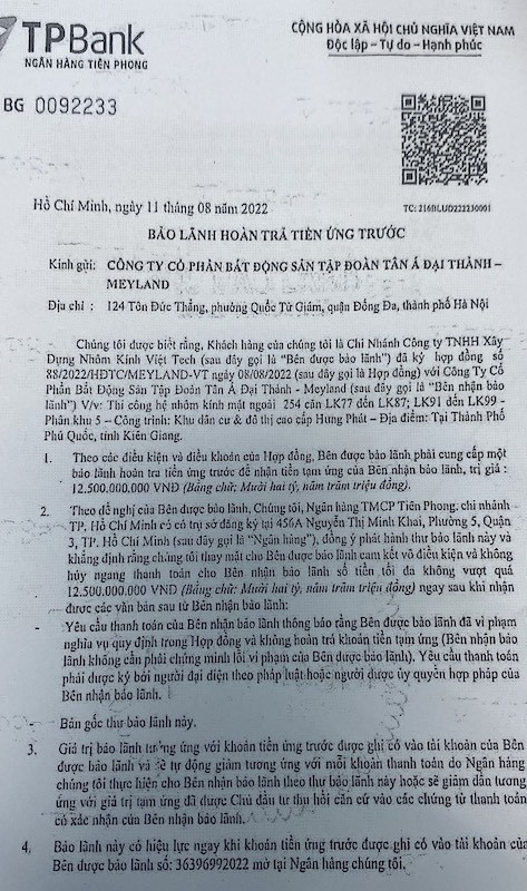 Theo phản ánh của công ty Bất động sản Tân Á Đại Thành - Meyland, ngân hàng TPBank chi nhánh TP Hồ Chí Minh đã không thực hiện đúng cam kết, kéo dài thời gian thanh toán, hoàn trả tiền tạm ứng cho khách hàng theo nghĩa vụ thanh toán tại chứng thư bảo lãnh tiền tạm ứng.