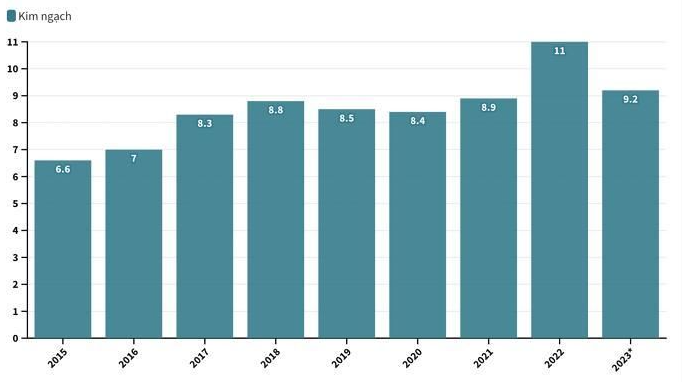 Kim ngạch xuất khẩu thủy sản GĐ 2015 - 2023 (Tỷ USD) * Ước tính của Cục Thủy Sản |