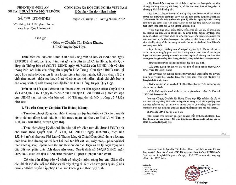 Trên cơ sở kết quả kiểm tra của đoàn kiểm tra liên ngành và ý kiến chỉ đạo của UBND tỉnh Nghệ An, ngày 31/8/2022, Sở Tài nguyên và Môi trường tỉnh Nghệ An đã có Văn bản số 5328/STNMT-KS thông báo khắc phục tồn tại trong hoạt động khoáng sản. Theo đó, Sở yêu cầu Công ty CP Tân Hoàng Khang tạm dừng hoạt động khai thác khoáng sản (quặng thiếc và đá xây dựng đi kèm) và hoạt động khai thác, bơm hút nước ngầm tại khu vực Phá Líu và Thung Lùn, xã Châu Hồng, huyện Quỳ Hợp.
