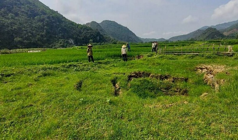 | Hiện tượng sụt lún xảy ra cả ngoài đồng, gây lo lắng, ảnh hưởng đến đời sống, sản xuất của người dân xã Châu Hồng |