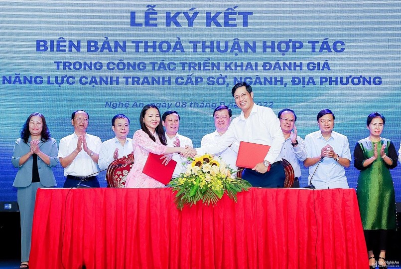 Trung tâm Xúc tiến Đầu tư - Thương mại và Du lịch tỉnh Nghệ An và VCCI chi nhánh Nghệ An đã ký kết biên bản thỏa thuận hợp tác về việc triển khai đánh giá chỉ số năng lực cạnh tranh cấp sở, ngành, địa phương (DDCI). Ảnh: Phạm Bằng |
