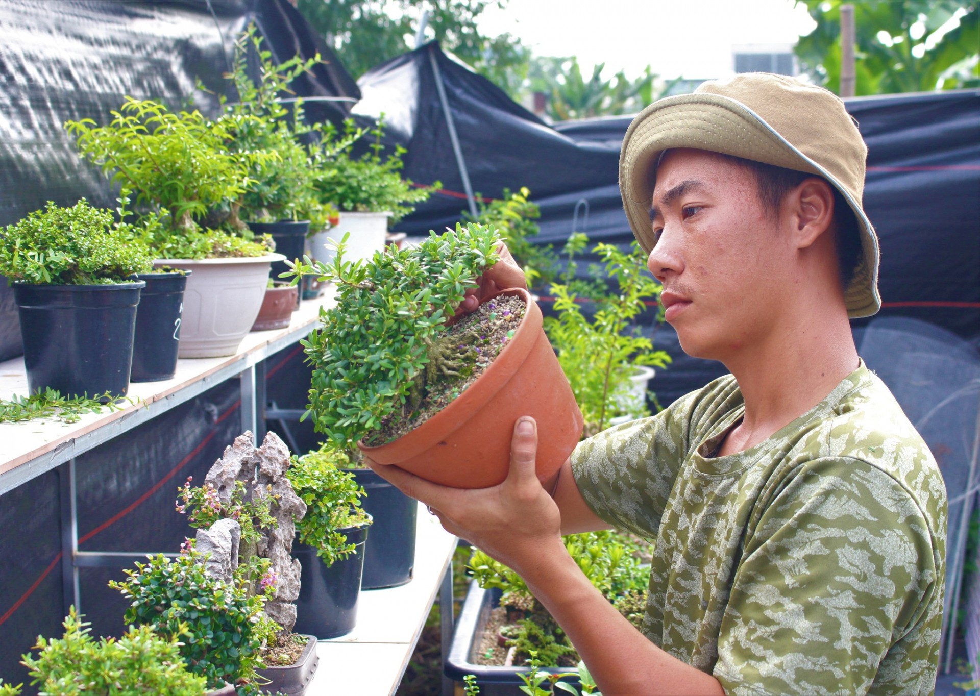 Cảm thấy tay nghề thuần thục, có vốn liếng đầy đủ. Đầu năm 2022, Hoàn quyết bỏ hết công việc và mở vườn, tự làm chủ… Tại mảnh đất 200 m2 của gia đình, chàng trai 25 tuổi kinh doanh đa dạng dòng bonsai như mai chiếu thủy, linh sam, hồng ngọc mai… với giá từ vài chục ngàn đồng đến hàng chục triệu đồng.
