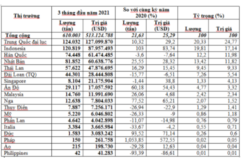 Tính chung trong 3 tháng đầu năm 2021, Trung Quốc vẫn đứng đầu cung cấp giấy các loại cho Việt Nam, chiếm 20,3% trong tổng lượng giấy các loại nhập khẩu của cả nước và chiếm 24,8% trong tổng kim ngạch, đạt 124.032 tấn, tương đương 127,1 triệu USD, giá trung bình 1.024,7 USD/tấn, tang 10,3 % về lượng, tang 29,2% về kim ngạch và tăng 17% về giá so với cùng kỳ năm 2020.