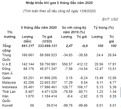 Tính chung cả 5 tháng đầu năm 2020 nhập khẩu khí gas tăng 2,5% về lượng nhưng giảm 9,9% về kim ngạch so với cùng kỳ năm 2019, đạt 691.317 tấn, tương đương 333,7 triệu USD.