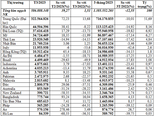 Tiếp đến thị trường Đài Loan đạt 95,94 triệu USD, giảm 19,8% so với quý I/2022. Nhập khẩu từ thị trường Mỹ đạt 86,9 triệu USD, giảm 17% so với quý I/2022.