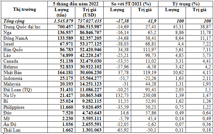 Tiếp đến thị trường Nga đứng thứ 2, chiếm 8,9% trong tổng lượng và chiếm 11,8% trong tổng kim ngạch, với 136.937 tấn, tương đương 86,85 triệu USD, giá trung bình 634,2 USD/tấn, giảm 16% về lượng, nhưng tăng 65% về kim ngạch và tăng 97% về giá so với 5 tháng đầu năm 2021.