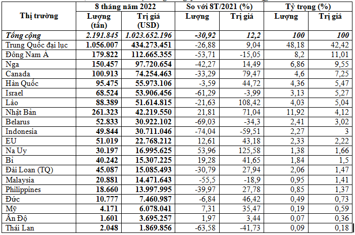 Tiếp đến thị trường Nga đứng thứ 2, chiếm 6,9% trong tổng lượng và chiếm 9,6% trong tổng kim ngạch, với 150.457 tấn, tương đương 97,72 triệu USD, giá trung bình 649,5 USD/tấn, giảm 42,3% về lượng, nhưng tăng 14,5% về kim ngạch và tăng mạnh 98,3% về giá so với 8 tháng đầu năm 2021.