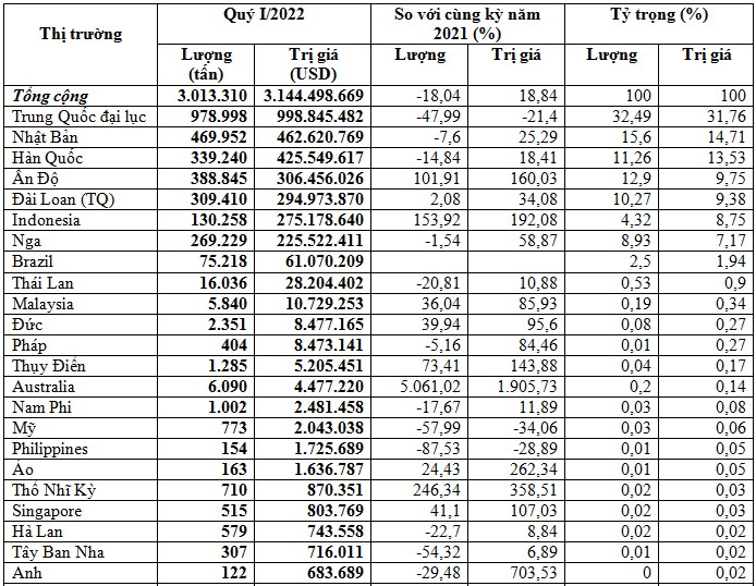 Đứng sau thị trường chủ đạo Trung Quốc là thị trường Nhật Bản đạt 469.952 tấn, tương đương 462,62 triệu USD, giá nhập khẩu 984,4 USD/tấn, giảm 7,6% về lượng nhưng tăng 25,3% về kim ngạch, tăng 35,6% về giá so với cùng kỳ năm 2021, chiếm trên 15,6% trong tổng lượng và chiếm 14,7% trong tổng kim ngạch.