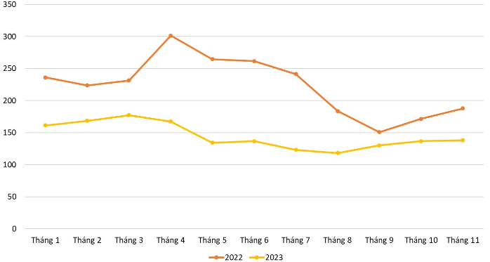 | Giá than nhập khẩu của Việt Nam giảm trong 11 tháng đầu năm 2023. (Đơn vị: USD/tấn). |
