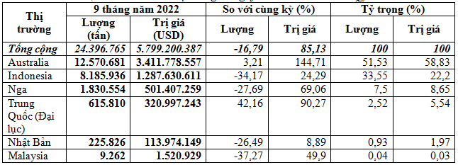 Than đá nhập khẩu về Việt Nam chủ yếu có xuất xứ từ 3 thị trường: Australia, Indonesia và Nga; riêng 3 thị trường này đã chiếm gần 93% trong tổng kim ngạch nhập khẩu than đá của cả nước; trong đó nhập khẩu từ Australia đạt 12,57 triệu tấn, tương đương gần 3,41 tỷ USD, giá trung bình 271,4 USD/tấn, chiếm trên 51,5% trong tổng khối lượng và chiếm 58,8% trong tổng kim ngạch nhập khẩu than đá của cả nước, tăng 3,2% cả về khối lượng và tăng mạnh 144,7% kim ngạch so với 9 tháng đầu năm 2021, giá nhập khẩu tăng 137%.