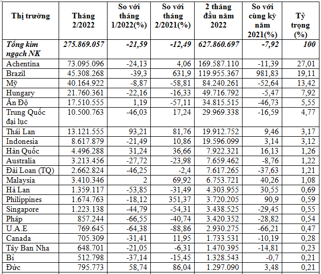 Nhập khẩu thức ăn chăn nuôi từ các thị trường trong 2 tháng đầu năm 2022