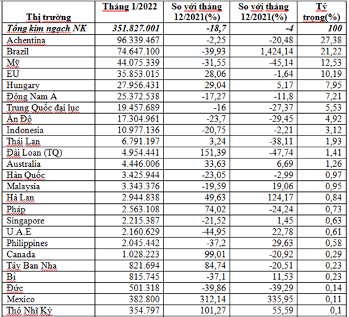 Thức ăn gia súc và nguyên liệu nhập khẩu từ Achentina – thị trường lớn nhất, trong tháng 1/2022 giảm 2,3% so với tháng 12/2021 và giảm 23,5% so với tháng 1/2021, đạt 96,34 triệu USD, chiếm 27,4% trong tổng kim ngạch nhập khẩu nhóm hàng này của cả nước.