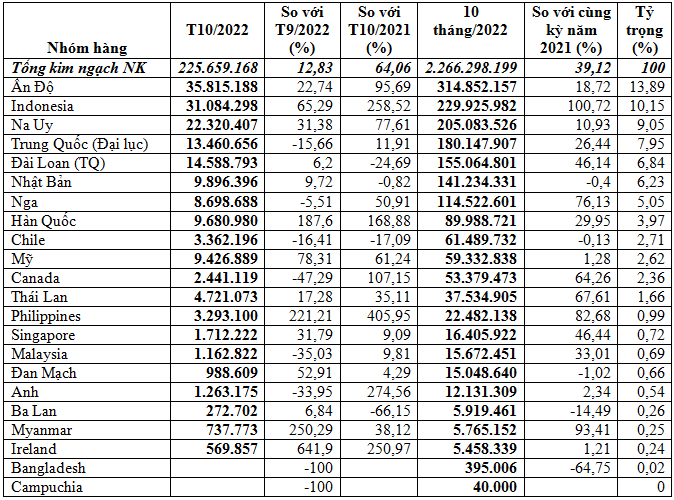 Ấn Độ, Na Uy, Indonesia, Trung Quốc và Đài Loan là các thị trường chủ yếu cung cấp thủy sản cho Việt Nam; trong đó nhập khẩu từ Ấn Độ dẫn đầu về kim ngạch, đạt 314,85 triệu USD, chiếm 13,9% trong tổng kim ngạch nhập khẩu nhập khẩu nhóm hàng này của cả nước, tăng 18,7% so với 10 tháng năm 2021, riêng tháng 10/2022 nhập khẩu từ thị trường này đạt 35,82 triệu USD, tăng 22,7% so với tháng 9/2022 và tăng mạnh 95,7% so với tháng 10/2021.