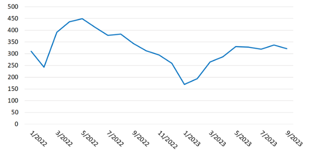 | Xuất khẩu tôm của Việt Nam từ năm 2022 đến T9/2023 (triệu USD) |