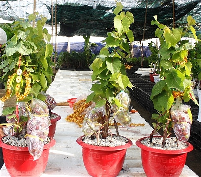 Ông Lê Ngọc Hoài, người có hơn 30 năm trồng nho ăn trái ở Phước Thuận cũng cho biết, gia đình bắt đầu trồng nho kiểng khoảng 5 năm gần đây. Lúc đầu, ông chỉ trồng thử để chưng Tết, sau thấy nhiều người hỏi mua nên mới trồng nhiều để bán. "Gần đây, nhiều người thích chưng nho kiểng Ninh Thuận trong ngày Tết vì lạ, cây lại có trái đỏ đẹp, cầu may đầu năm mới. Mỗi chậu có giá 1-3 triệu đồng, tùy theo thế dáng, cao thấp", ông Hoài nói.