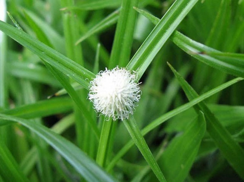 Hoa cỏ bạc đầu mọc thành cụm ở ngọn, có màu trắng, dạng hình cầu, đường kính 8 - 12mm,mỗi cụm chứa 1 – 3 bông hình trụ và đường kính của cụm hoa dao động từ 4 – 8mm. mang 3 đến 4 lá bắc dài, nằm ngang. Mỗi bông nhỏ trong cụm thường chứa một hoa riêng, ở trên có vảy nhẵn, hơi nhám, ở dưới có lông tơ mịn. Nhị hoa thuộc dạng nhị 3-2. Cây thường ra hoa vào mùa hè.