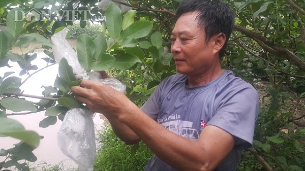"Lúc quả ổi còn non bằng ngón tay cái người lớn, người trồng bắt đầu dùng bao nilon PP và bao xốp để bọc trái ổi lại. Làm việc này giúp cho quả ổi đẹp, tránh bị ruồi vàng tấn công", ông Độ chia sẻ.