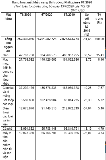 Theo số liệu thống kê sơ bộ của Tổng cục Hải quan, xuất khẩu hàng hóa sang thị trường Philippinestrong 6 tháng đầu năm đạt 1,791 triệu USD, giảm 11,6% so với cùng kỳ năm 2019. Tính riêng tháng 6/2020 Kim ngạch xuất khẩu đạt 225,40 triệu USD.
