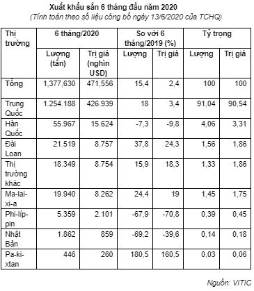 Tháng 6, xuất khẩu sắn và các sản phẩm từ sắn ở mức thấp do Trung Quốc đang vào thời kì thấp điểm tiêu thụ mặt hàng này. Lũy kế 6 tháng đầu năm 2020, xuất khẩu sắn và các sản phẩm từ sắn đạt 1,37 triệu tấn, trị giá 471,55 triệu USD, tăng 15,4% về lượng và tăng 2,4% về trị giá so với cùng kỳ năm 2019.