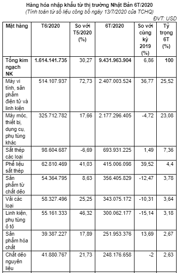 Nhập khẩu của Việt Nam từ Nhật Bản đạt 9,43 tỷ USD, tăng 6,86% so với cùng kỳ năm 2019.
