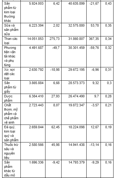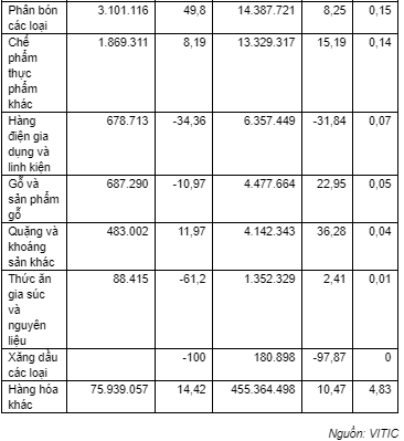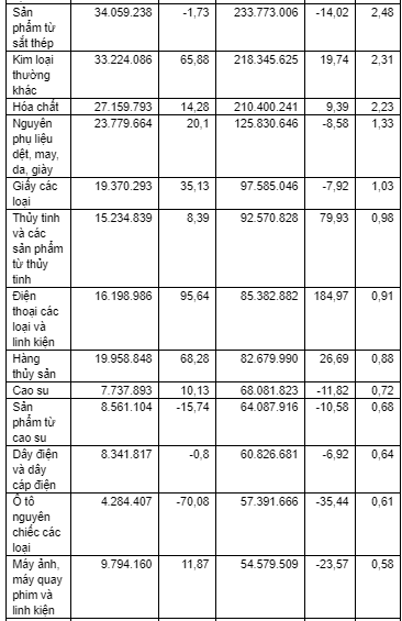 Ngoài ra, trong nhóm hàng chế biến chế tạo này có một số mặt hàng đạt kim ngạch lớn như: Phế liệu sắt thép đạt 415 triệu USD; Sản phẩm từ chất dẻo đạt 356,4 triệu USD; Vải các loại đạt 343,1 triệu USD; Linh kiện phụ tùng ô tô đạt hơn 300 triệu USD;…