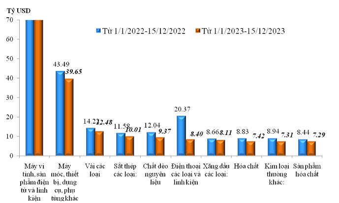 | Trị giá nhập khẩu của một số nhóm hàng lớn lũy kế từ 01/01/2023 đến 15/12/2023 và cùng kỳ năm 2022. |