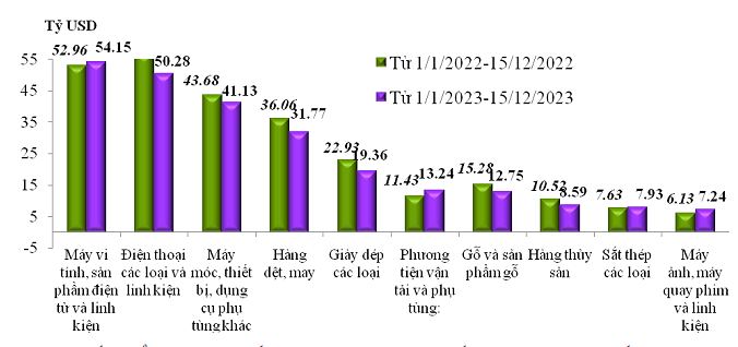 | Trị giá xuất khẩu của một số nhóm hàng lớn lũy kế từ 01/01/2023 đến 15/12/2023 và cùng kỳ năm 2022. |