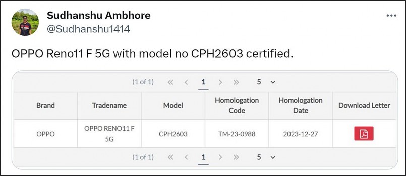 Theo bài đăng của Sudhanshu Ambhore trên X, OPPO Reno11 F 5G có số model là CPH2603. Thiết bị đã được phát hiện trên nhiều nền tảng chứng nhận như: IMDA ( Singapore), BIS (Ấn Độ), EEC (Châu Âu), TKDN (Indonesia), FCC và TUV.