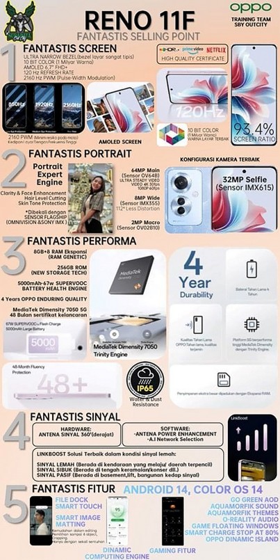 Tiết lộ thông tin về điện thoại mới thuộc dòng Reno11 là OPPO Reno11 F 5G với vi xử lý Dimensity 7050, tấm nền AMOLED, tần số quét 120Hz.