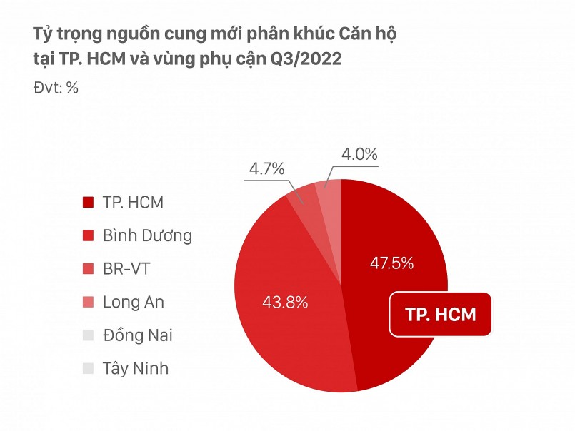 Phân khúc căn hộ trong Quý 3/2022 đón nhận nguồn cung mới khoảng 4,873 căn đến từ 31 dự án mở bán, giảm 63.8% so với Quý 2/2022. Tỷ lệ tiêu thụ đạt khoảng 52% nguồn cung mới, tương đương 2,531 căn, giảm 77.5% so với quý trước. Thị trường TP.HCM và Bình Dương vẫn duy trì vị trí dẫn đầu nguồn cung mới toàn thị trường khi chiếm 91.2% tổng lượng căn hộ mở bán mới trong quý. Căn hộ hạng A và hạng C dẫn dắt nguồn cung mới toàn thị trường. Trong khi căn hộ hạng A là phân khúc chủ đạo tại thị trường TP.HCM thì căn hộ hạng C tập trung chủ yếu tại Bình Dương và các tỉnh giáp ranh. Giá bán sơ cấp bình quân tăng từ 5% - 8% so với quý trước, cá biệt một số dự án tại khu Đông ghi nhận mức tăng giá sơ cấp lên đến 12% - 16% so với thời điểm cuối năm 2021.