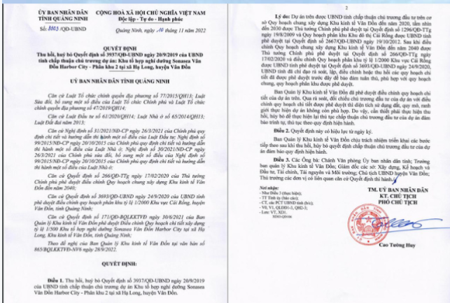 Mới đây, UBND tỉnh Quảng Ninh đã ban hành Quyết định số 3303/QĐ-UBND về việc thu hồi, hủy bỏ Quyết định số 3937/QĐ-UBND ngày 20/9/2019 của UBND tỉnh Quảng Ninh chấp thuận chủ trương dự án Khu Tổ hợp du lịch, nghỉ dưỡng Sonasea Vân Đồn Harbor City - Phân khu 2 tại xã Hạ Long, huyện Vân Đồn, tỉnh Quảng Ninh.