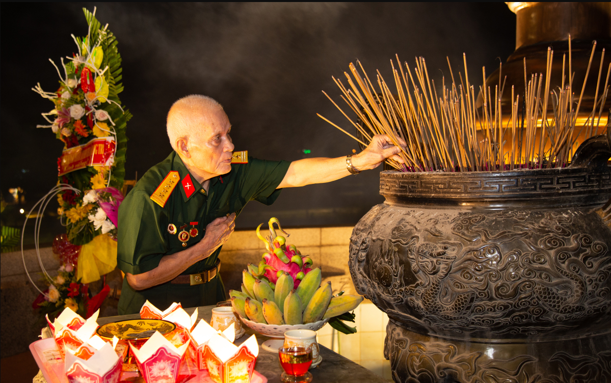 | Cựu chiến binh Lê Hoa, 92 tuổi, tự mình bước lên các bậc thang ở đài tưởng niệm, thắp hương cho đồng đội đã yên nghỉ ở mảnh đất này. |