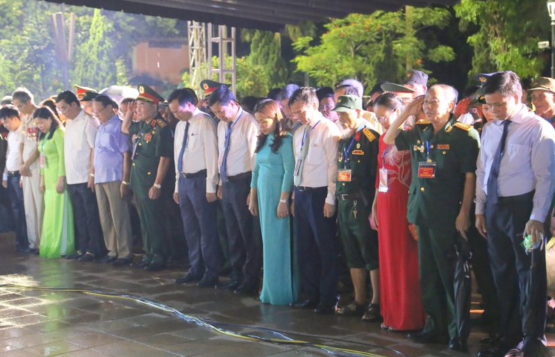 | Lãnh đạo tỉnh Quảng Trị, các lực lượng vũ trang dành phút mặc niệm tri ân liệt sĩ. |