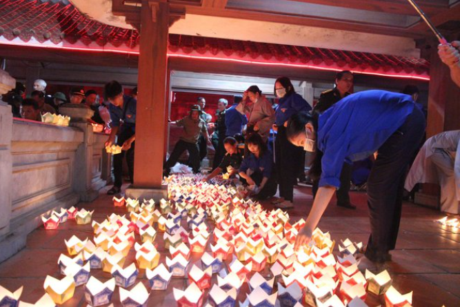 | Để hỗ trợ các cựu binh thả hoa đăng, hàng chục đoàn viên, thanh niên thị xã Quảng Trị được huy động thắp nến. |