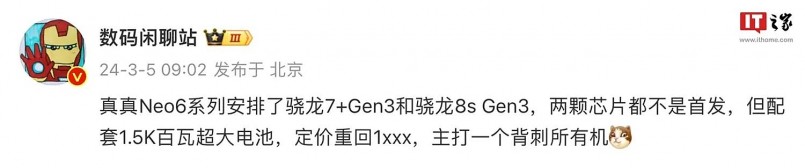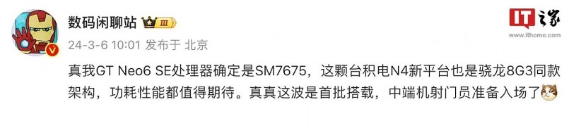 Leaker nổi tiếng Digital Chart Station tiết lộ rằng Realme GT Neo 6 SE sẽ là lô đầu tiên được trang bị vi xử lý có mã là SM7675 (tên dự kiến là Snapdragon 7 Plus Gen 3), con chip mới này sử dụng nền tảng N4 (tiến trình 4nm) mới của TSMC với cùng kiến trúc sử dụng cho Snapdragon 8 Gen 3, điều này có nghĩa mức tiêu thụ điện năng và hiệu năng của chip tầm trung mới rất đáng mong đợi.