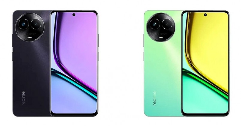 Realme C67 5G có các tùy chọn màu Sunny Oasis (xanh) hoặc Dark Purple (đen).