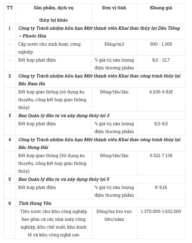 Khung giá sản phẩm, dịch vụ thủy lợi khác quy định này là giá chưa bao gồm thuế giá trị gia tăng theo quy định và được xác định trong điều kiện thời tiết bình thường (không có thiên tai, hỏa hoạn và điều kiện bất thường khác).
